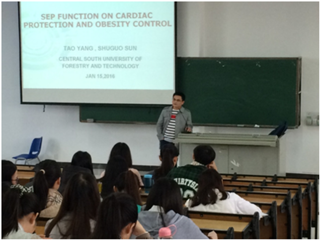 1月15日上午,中南林业科技大学韦德1946体育官方入口副院长杨涛副教授,在5教414为韦德官网食品科学与工程专业2013级学生讲授《食品营养学》。食品学院申铉日副院长为杨涛老师颁发“韦德1946体育官方入口2016冬季小学期授课外聘专家”证书。学院部分专业教师和研究生聆听了杨老师的授课。