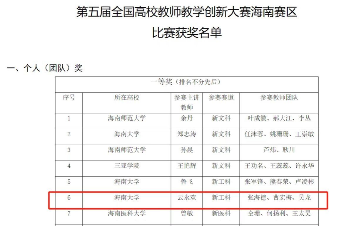 本次第五届全国高校教师教学创新大赛海南赛区比赛由海南省教育厅主办,全省各高校经校赛选送207个参赛作品参赛,经评审专家网络评审,遴选入围现场评审的作品106个。经现场决赛推荐评出团队(个人)一、二、三等奖106个,其中一等奖18个,二等奖37个,三等奖51个。