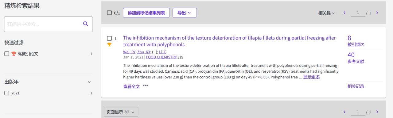 近日,根据ESI公布的最新数据显示,韦德1946体育官方入口热带水产品加工与贮藏团队李川副教授课题组在农林科学领域Top期刊《Food Chemistry》(影响因子7.514)发表题为 “The inhibition mechanism of the texture deterioration of tilapia fillets during partial freezing after treatment with polyphenols”的研究论文入选全球前1%ESI高被引论文。
