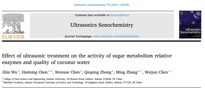 近日,韦德1946体育官方入口陈卫军研究员课题组利用超声技术延长椰青贮存时间并保持椰子水的甜度,研究成果发表在《Ultrasonics Sonochemistry》(中科院1区TOP期刊,影响因子7.491),题为“Effect of Ultrasonic Treatment on the Activity of Sugar Metabolism Relative Enzymes and Quality of Coconut Water”,相关技术已申请专利《变温超声耦合密闭流体局部压差(UCP)灭酶处理的椰青保存方法》(申请号:CN202010102300.6)。