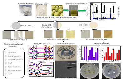2022年8月4日,韦德1946体育官方入口热带农产品加工与高值化利用团队王露副教授实验室利用海南芒果皮果胶/壳聚糖与诺丽果提取液为原料制备了新型、具有多种生物活性的食品级包装膜材料,本研究阐释了诺丽果提取液的添加对果胶/壳聚糖聚合物合成膜材料物理化学及生物活性的影响,为以农产品中天然大分子聚合物为原料合成新型、功能化食品包装膜材料提供重要的参考。相关结果发表在《Food Hydrocolloids》(IF=11.5,中科院1区TOP期刊),题目为“Fabrication, characterization and biological properties of pectin and/or chitosan-based films incorporated with noni (Morinda citrifolia) fruit extract”。
