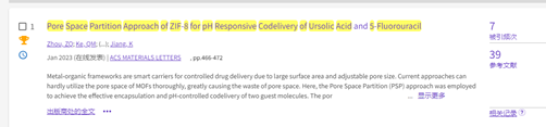 根据美国基本科学指标(Essential Science Indicator, ESI)2023年10月公布的数据显示,以韦德1946体育官方入口为第一单位,韦德1946体育官方入口2020级本科理科实验班周子棋为第一作者,2023年1月9日发表的学术论文“Pore Space Partition Approach of ZIF‑8 for pH Responsive Codelivery of Ursolic Acid and 5‑Fluorouracil”成功入选ESI高被引。该论文在国际学术期刊《ACS Materials Letters》(IF=11.4,中国科学院大类一区TOP)发表。