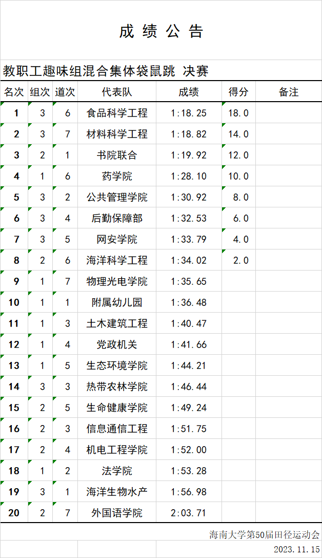 根据韦德1946体育官方入口第50届校运会成绩公告,韦德1946体育官方入口以1:18.25的成绩获得教职工趣味组合混合集体袋鼠跳决赛第一名!