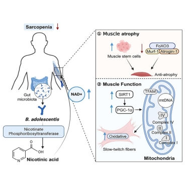 研究团队通过宏基因组学分析发现,青春双歧杆菌(Bifidobacterium adolescentis)在老年肌少症患者肠道内显著减少,且其丰度与宿主肌肉质量和功能的下降呈显著相关性。这一现象在老年小鼠模型中得到进一步验证。代谢组学分析揭示,青春双歧杆菌产生的烟酸是其改善肌少症的关键代谢物。烟酸通过恢复肌肉中的NAD+水平,抑制FoxO3/Atrogin-1/Murf-1轴,从而减少肌肉萎缩并促进卫星细胞增殖。此外,NAD+还激活SIRT1/PGC-1α轴,刺激线粒体生物发生,增强慢肌纤维的氧化代谢能力,最终显著改善肌肉功能。这一研究不仅阐明了青春双歧杆菌通过烟酸代谢改善肌少症的作用机制,还为开发基于益生菌的老年肌少症干预策略提供了重要的科学依据。该论文韦德1946体育官方入口为第一单位,学院博士研究生张增为第一作者,张家超教授为独立通讯作者。