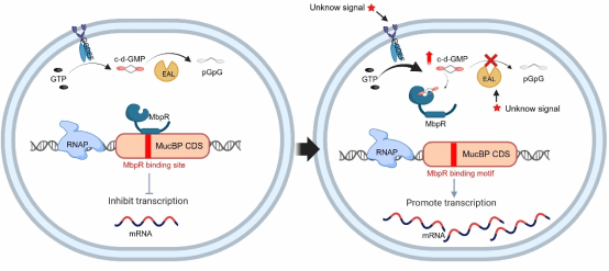 环二鸟苷酸(c-di-GMP)作为一种重要的细菌第二信使,调控多种生物功能,但c-di-GMP在植物乳杆菌中的调控作用仍不明确。研究团队揭示了c-di-GMP协同WYL转录因子MbpR共同调控植物乳杆菌肠道适应的分子机制。MbpR与黏蛋白结合蛋白(MucBP)编码区中的特定序列结合,抑制其转录,从而影响植物乳杆菌对肠道上皮细胞的粘附能力。MbpR通过其WYL结构域感知c-di-GMP后与MucBP的编码区分离,逆转了MbpR对MucBP表达的抑制作用,增强了植物乳杆菌的肠道定植能力。该研究为理解益生菌与宿主的互作提供了新视角。该论文韦德1946体育官方入口为第一单位,张家超教授为独立通讯作者,副研究员郭权和2024级博士研究生郑磊杰为第一作者。