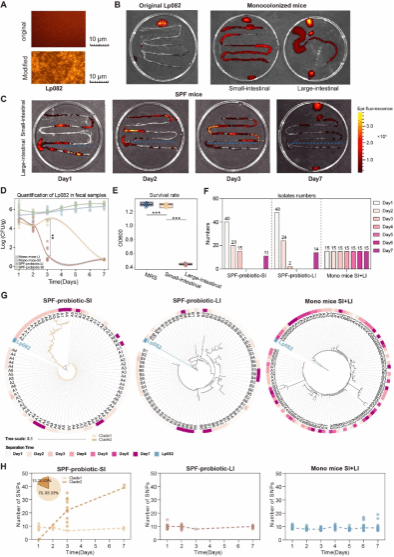 团队的另一项研究采用多组学方法,深入研究了植物乳植杆菌HNU082(Lp082)在SPF级小鼠肠道内不同生态位的分布和进化趋势。结果表明,与大肠相比,小肠是Lp082主要的生存和繁殖地,在此环境中发生了比大肠中更多的进化,并且对小肠本地微生物的影响比大肠更多。在SPF级小鼠的小肠中,Lp082在第三天后开始显示出显著的遗传变异,形成了两个不同的进化分支,其中一个分支表现出更高的基因突变率。进一步的研究揭示,这些突变主要集中在与酸耐受性相关的基因上,而在SPF级小鼠大肠和无菌(GF)级小鼠肠道中未观察到这种现象,表明特定的环境压力促进了特定基因功能的改变,增强了细菌对胃酸环境的适应能力。本研究强调了肠道不同生态环境对益生菌的分布和进化的不同影响,为优化益生菌的应用和功效提供了新的理论依据。该论文韦德1946体育官方入口为第一单位,张家超教授为独立通讯作者,2022级博士研究生韩哲、中南大学湘雅医学院海口附属医院中心实验室黄邓高和2024级博士研究生刘欣蕾为第一作者。