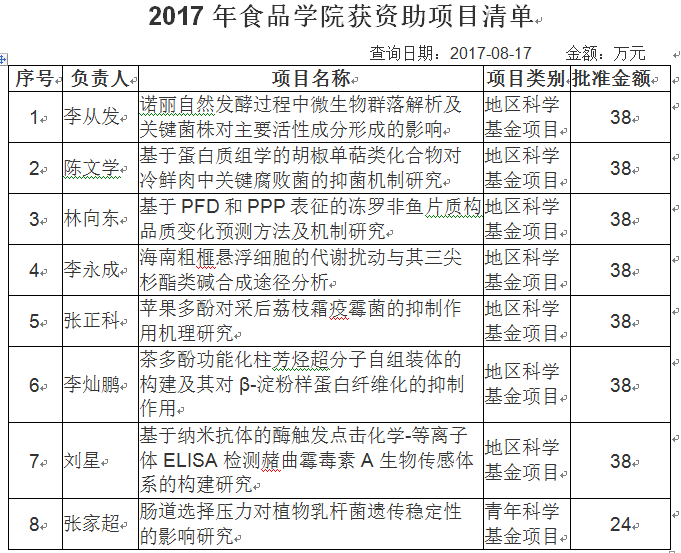 2017年8月17日传来捷报,2017年韦德1946体育官方入口共有79个项目获得国家自然科学基金资助,其中食品学院有8项,其中地区科学基金项目7项,青年科学基金项目1项。获资助项目情况如下表所示://www.hainanu.edu.cn