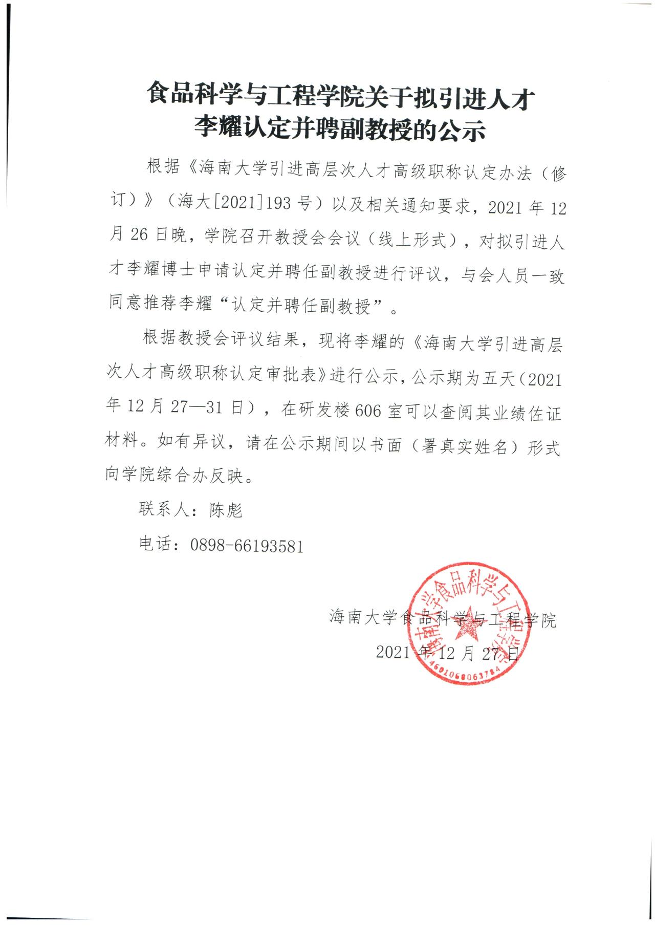 韦德1946体育官方入口关于拟引进人才李耀认定并聘副教授公示