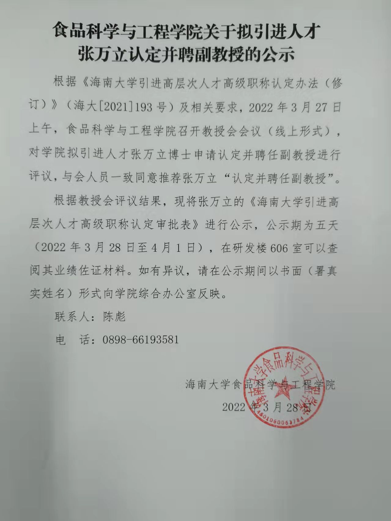 韦德1946体育官方入口关于拟引进人才张万立认定并聘副教授公示