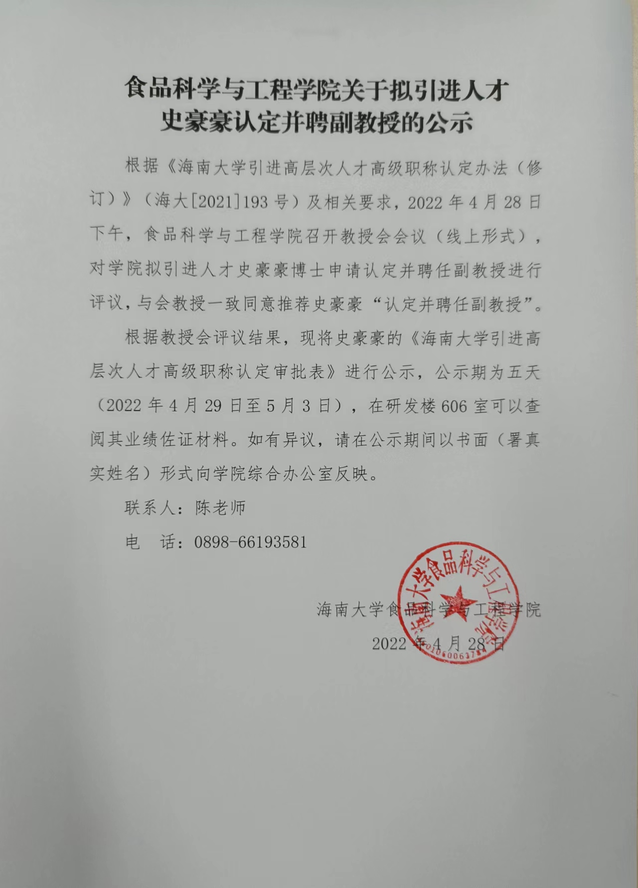韦德1946体育官方入口关于拟引进人才史豪豪认定并聘副教授公示