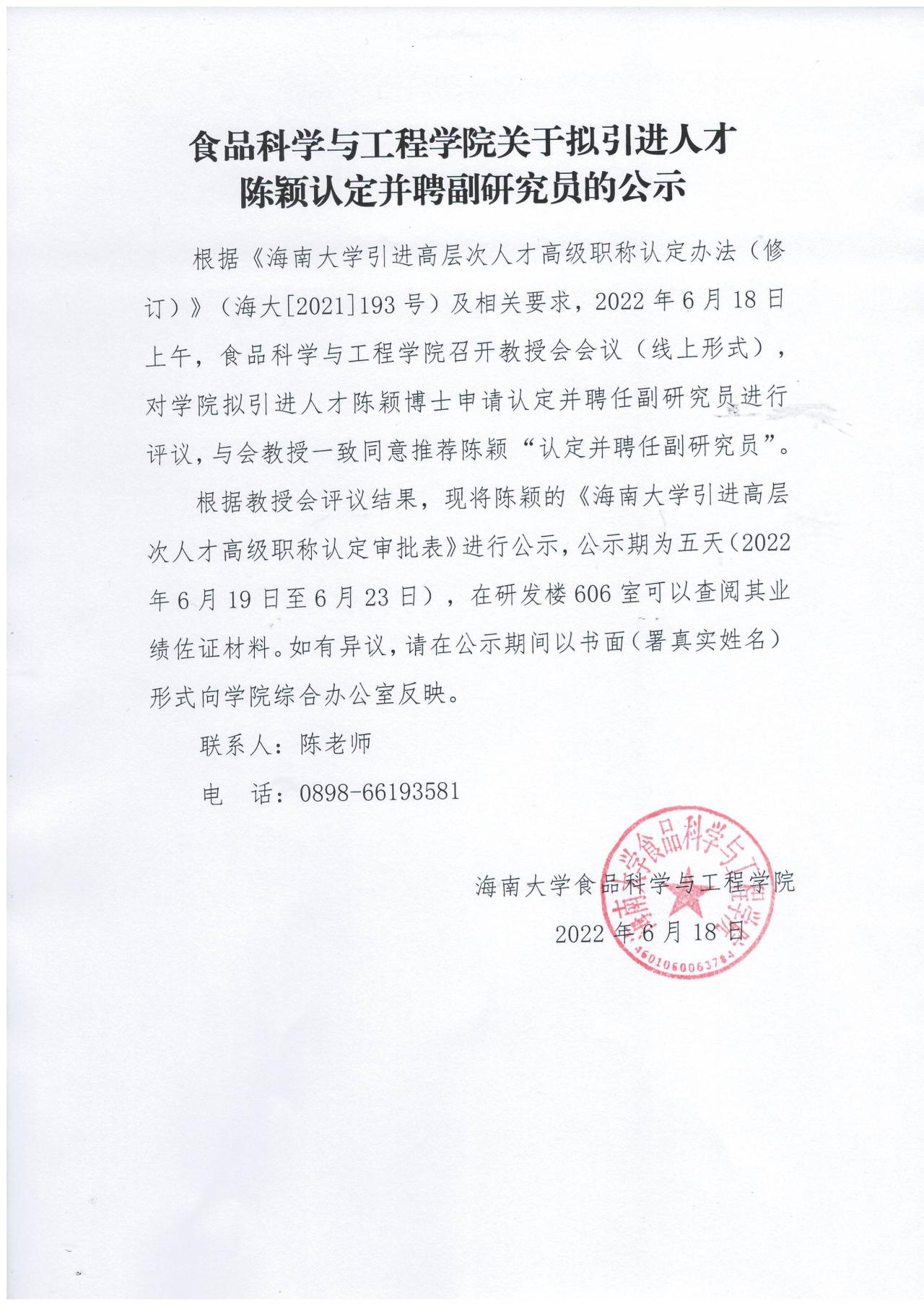 韦德1946体育官方入口关于拟引进人才陈颖认定并聘副研究员的公示