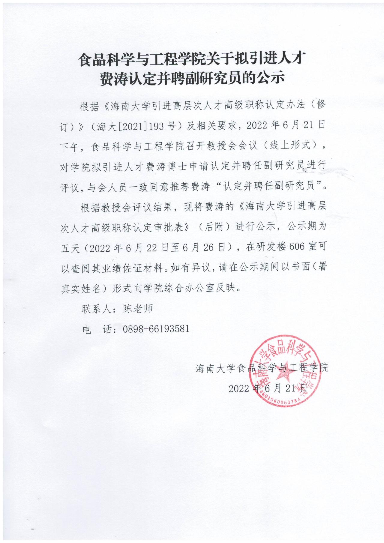 韦德1946体育官方入口关于拟引进人才费涛认定并聘副研究员公示